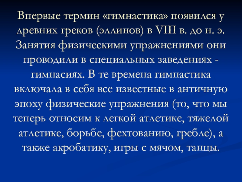 Слайд 2Впервые термин «гимнастика» появился у древних греков (эллинов) в VIII в.