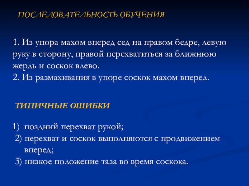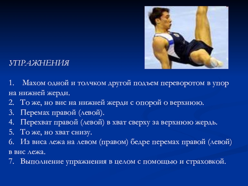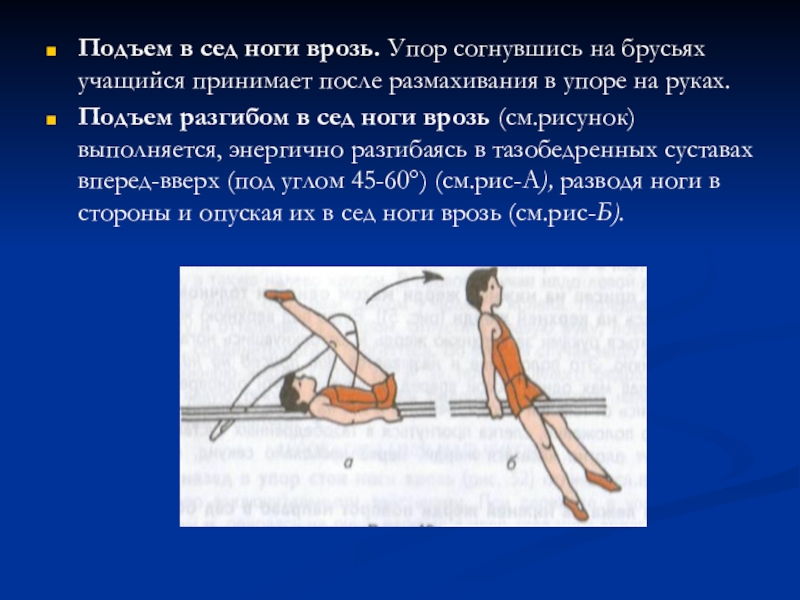 Размахивание в упоре, махом назад развести ноги и мягко опустить на жерди внутренними сторонами стоп, согнуть руки, оттолкнуться ногами, свести их и махом вперед разогнуть руки; сгибание и разгибание рук на махе, с помощью и страховкой.