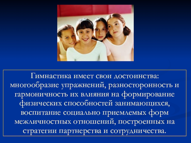 Слайд 3Гимнастика имеет свои достоинства: многообразие упражнений, разносторонность и гармоничность их влияния
