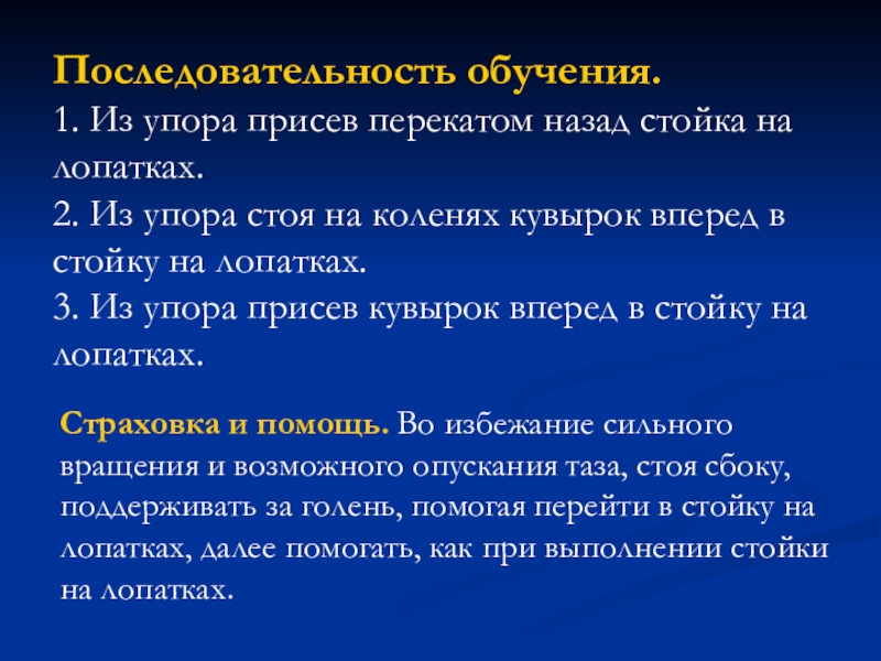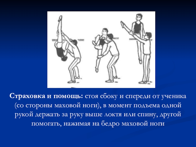 выхода в стойку исполнитель разводит ноги врозь, а страхующий поддерживает со стороны спины захватом около коленей.
