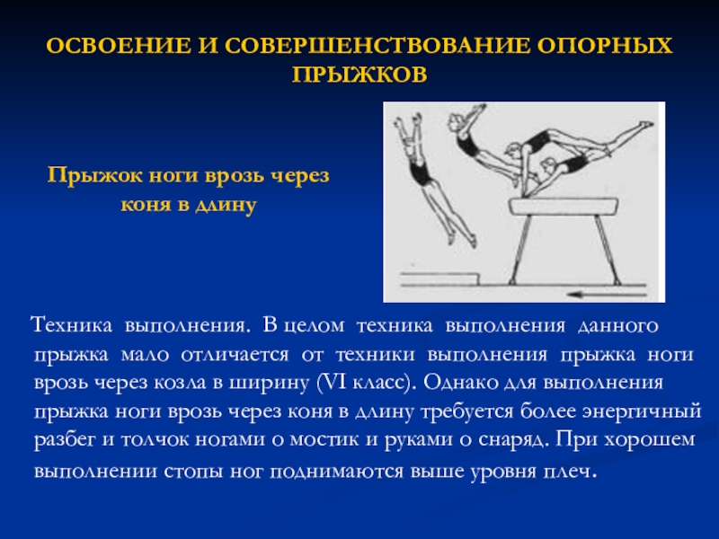 выполнения данного прыжка мало отличается от техники выполнения прыжка ноги врозь через козла в ширину (VI класс). Однако для выполнения прыжка ноги врозь через коня в длину требуется более энергичный разбег и толчок ногами о мостик и руками о снаряд. При хорошем выполнении стопы ног поднимаются выше уровня плеч.