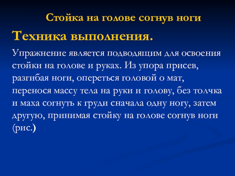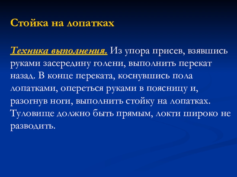 на 30-40 см), выпрямляя ноги, перенести массу тела на руки. Сгибая руки и наклоняя голову вперед, оттолкнуться ногами и, переворачиваясь через голову, сделать перекат на шею и лопатки.