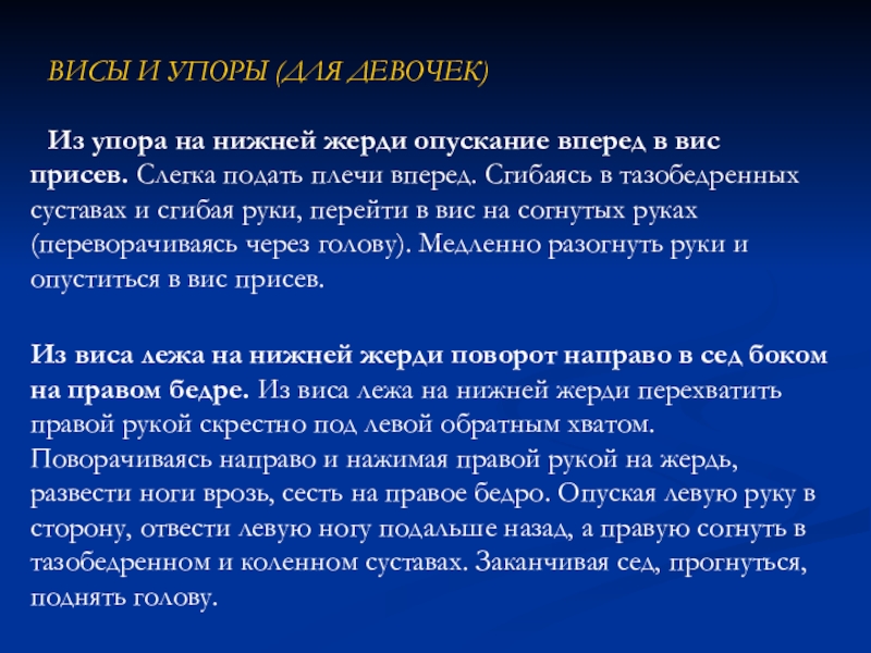 классах, расширяется и углубляется. Более сложными становятся упражнения в построениях и перестроениях, общеразвивающие упражнения без предметов и с предметами (набивными мячами, палками, обручами, скакалками, булавами, лентами), акробатические упражнения, упорные прыжки, упражнения в висах и упорах на различных гимнастических снарядах.