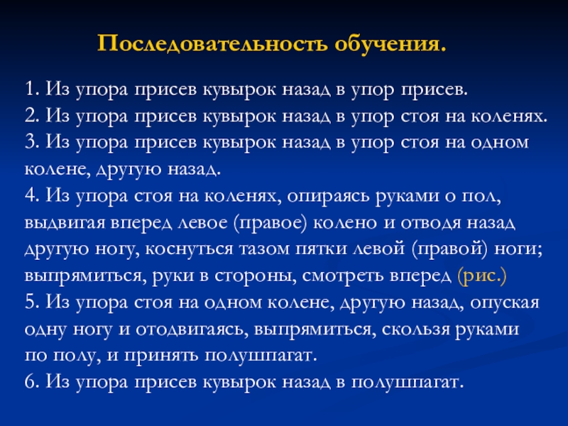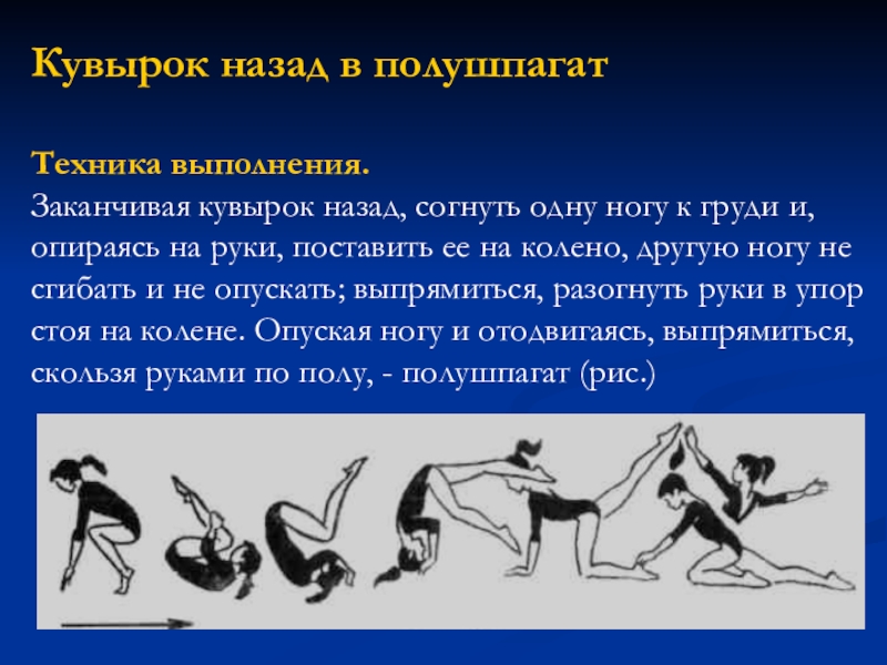 равновесие назад, опереться руками о пол около колен. Сед с прямыми ногами и кувырок назад через стойку на руках с помощью.