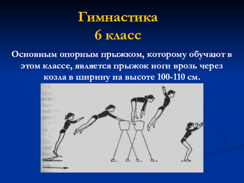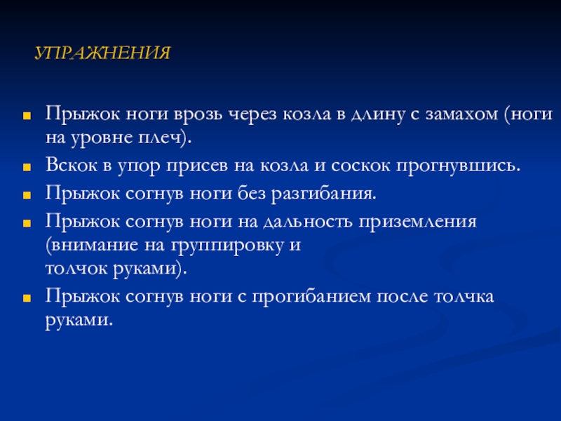 прыжку ноги врозь через козла в ширину, далее повторить следующие упражнения: