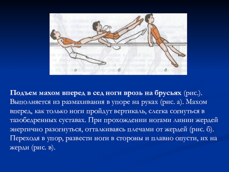 изучать вначале на низких брусьях. В этом случае в упор на руках согнувшись приходят махом одной и толчком другой ноги. Следят за тем, чтобы таз в упоре на руках согнувшись был на уровне головы или немного выше. Не задерживаясь в этом положении, надо энергично разогнуться, направляя ноги и таз вверх-вперед. Далее, тормозя движение ног и отталкиваясь плечами, надавить прямыми руками на жерди и перейти в сед ноги врозь (ноги разводятся в момент выхода в упор, после окончания разгибания тела).