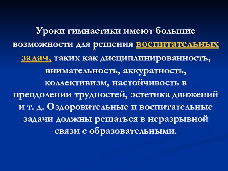 Слайд 10Уроки гимнастики имеют большие возможности для решения воспитательных задач, таких как