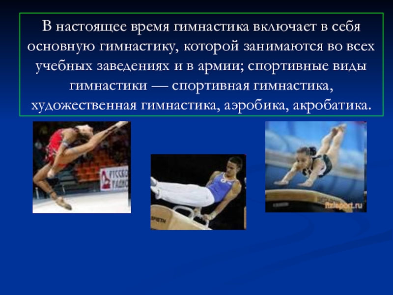 Слайд 4В настоящее время гимнастика включает в себя основную гимнастику, которой занимаются