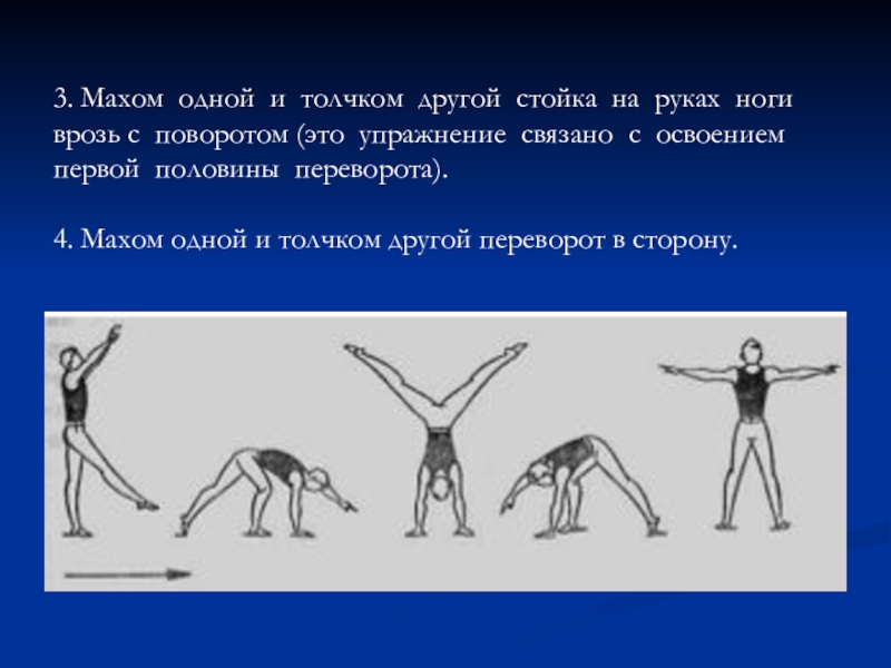 вперед и сделать шаг той ногой, в какую сторону выполняется переворот, затем, наклоняясь вперед, опереться о пол одноименной рукой (если переворот выполняется влево, то левой рукой) пальцами в эту же сторону на расстоянии шага от толчковой ноги и махом одной и