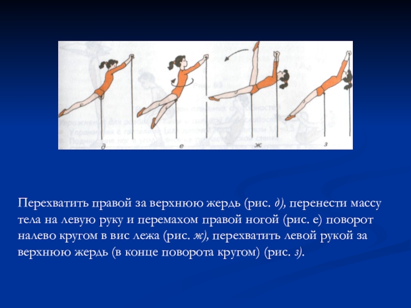 суставах и как только ноги приблизятся к жердям энергично разогнуться и выбросить ноги назад-вверх, а руками оттолкнуться от жердей и подать тело в сторону соскока (рис. а). Затем перехватиться правой (левой) в упор скрестно на левой (правой) жерди (рис. б). Продолжая мах назад, опустить правую (левую) руку, отвести ее в сторону (рис. в) и, удерживаясь за жердь другой рукой, закончить соскок.