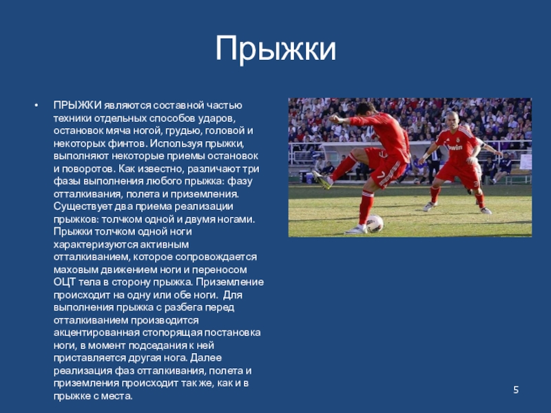 ПрыжкиПРЫЖКИ являются составной частью техники отдельных способов ударов, остановок мяча ногой, грудью, головой и некоторых финтов. Используя
