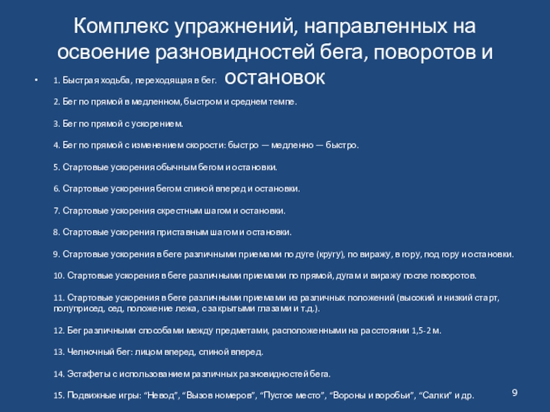 Слайд 9Комплекс упражнений, направленных на освоение разновидностей бега, поворотов и остановок