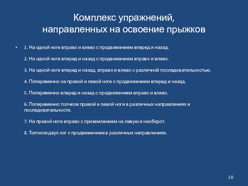 с продвижением вперед и назад. 2. На одной ноге вперед и назад с продвижением вправо и влево. 3. На одной ноге вперед и назад, вправо и влево с различной последовательностью. 4. Попеременно на правой и левой ноге с продвижением вперед и назад. 5. Попеременно вперед и назад с продвижением вправо и влево. 6. Попеременно толчком правой и левой ноги в различных направлениях и последовательности. 7. На правой ноге вправо с приземлением на левую и наоборот. 8. Толчком двух ног с продвижением в различных направлениях.