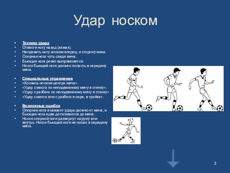 Удар носкомТехника удараОтвести ногу назад (замах).Направить ногу носком вперед, в сторону мяча.Спорная нога чуть сзади мяча.Бьющая нога