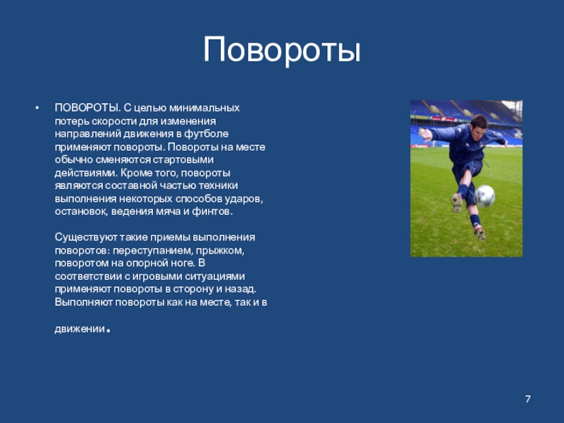 ПоворотыПОВОРОТЫ. С целью минимальных потерь скорости для изменения направлений движения в футболе применяют повороты. Повороты на месте