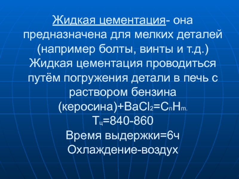Слайд 7Жидкая цементация- она предназначена для мелких деталей(например болты, винты и т.д.)