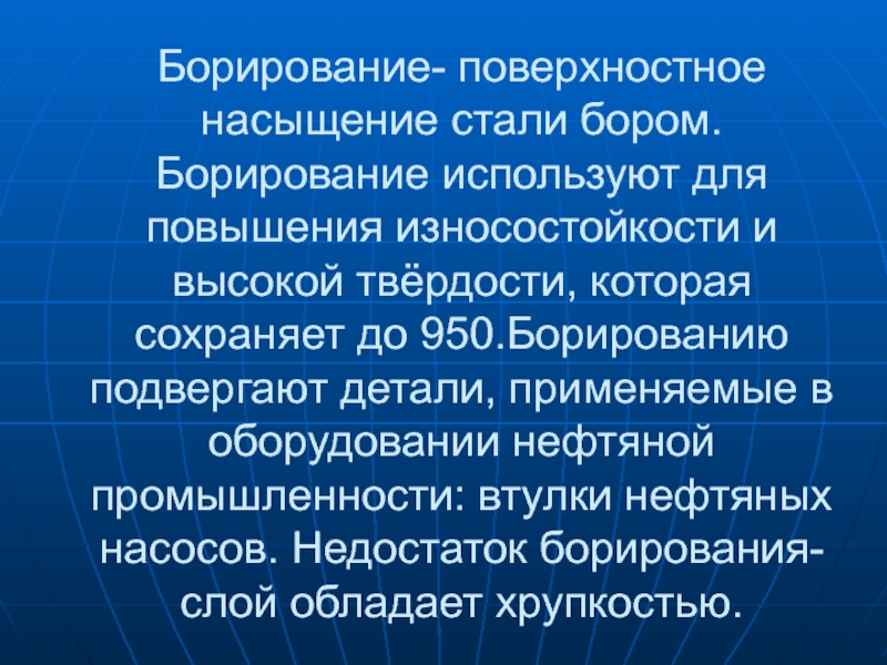 Слайд 18Борирование- поверхностное насыщение стали бором. Борирование используют для повышения износостойкости и
