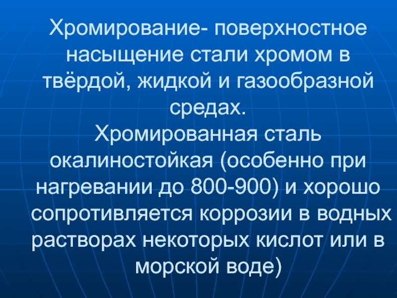 Слайд 16Хромирование- поверхностное насыщение стали хромом в твёрдой, жидкой и газообразной средах.
