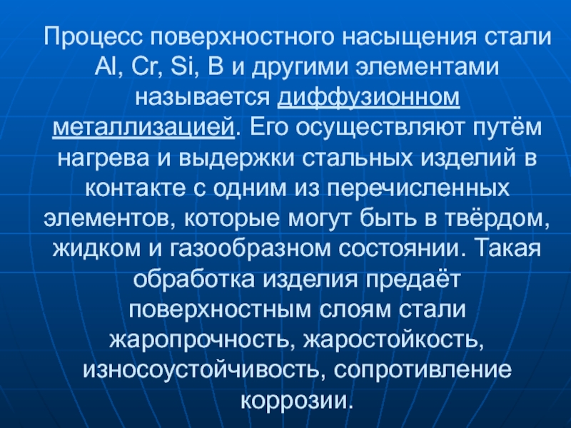 Слайд 14Процесс поверхностного насыщения стали Al, Cr, Si, B и другими элементами