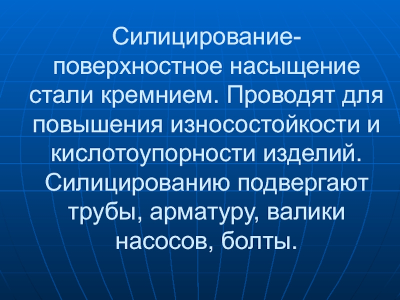 Слайд 17Силицирование- поверхностное насыщение стали кремнием. Проводят для повышения износостойкости и кислотоупорности