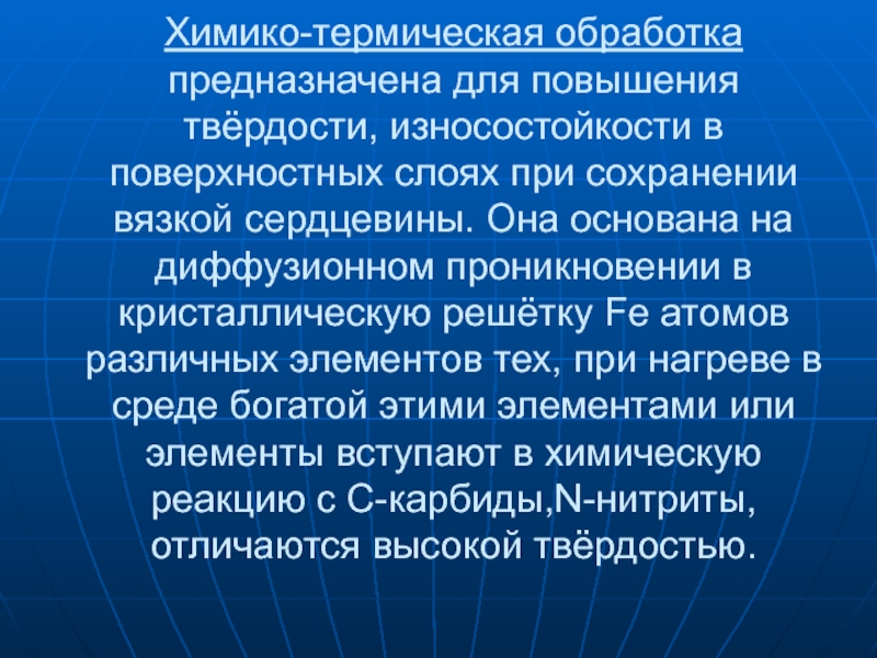 Слайд 3Химико-термическая обработка предназначена для повышения твёрдости, износостойкости в поверхностных слоях при