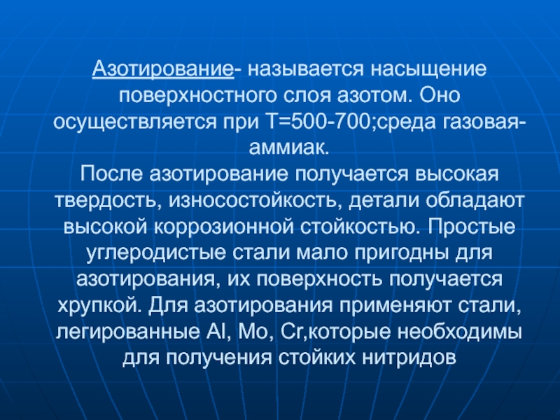 Слайд 13Азотирование- называется насыщение поверхностного слоя азотом. Оно осуществляется при Т=500-700;среда газовая-