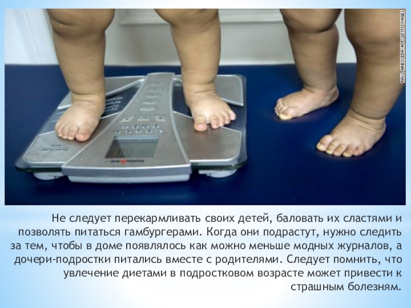 Слайд 17Не следует перекармливать своих детей, баловать их сластями и позволять питаться