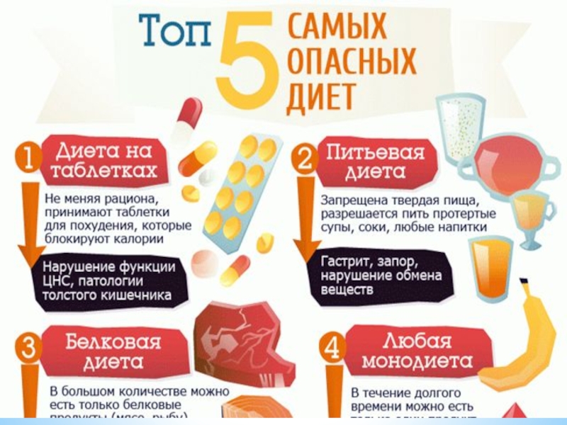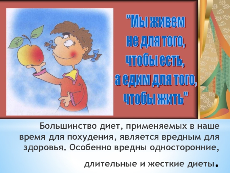 Слайд 5Большинство диет, применяемых в наше время для похудения, является вредным для
