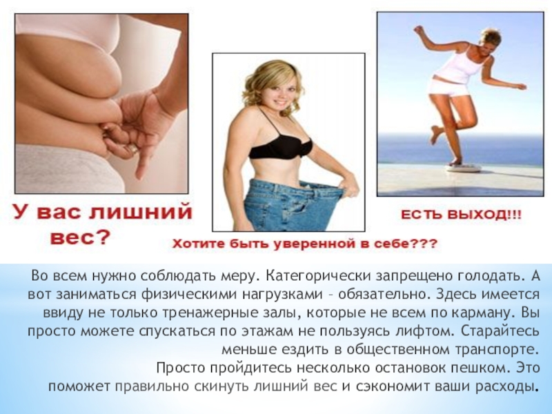 Слайд 25Во всем нужно соблюдать меру. Категорически запрещено голодать. А вот заниматься