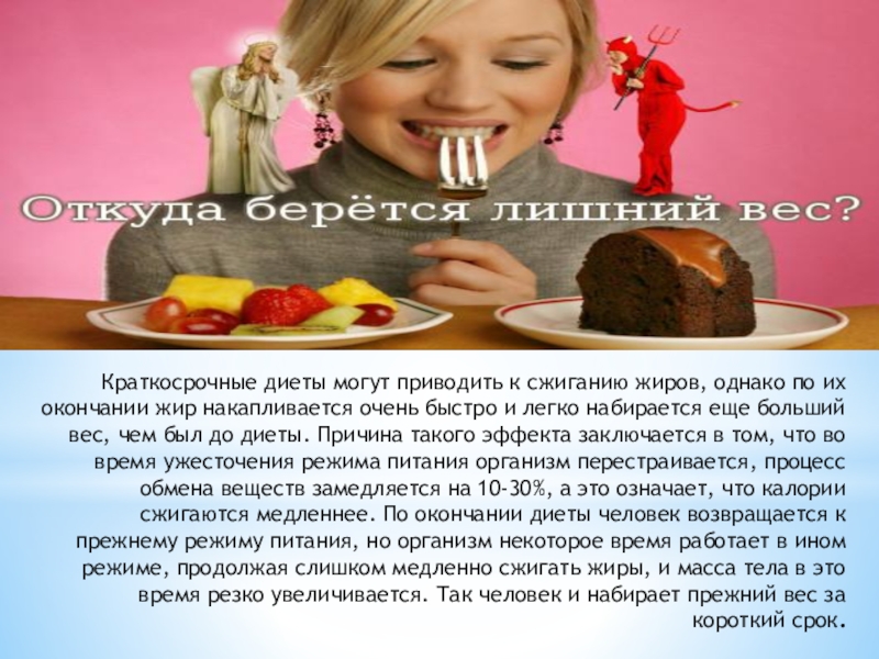 Слайд 18Краткосрочные диеты могут приводить к сжиганию жиров, однако по их окончании