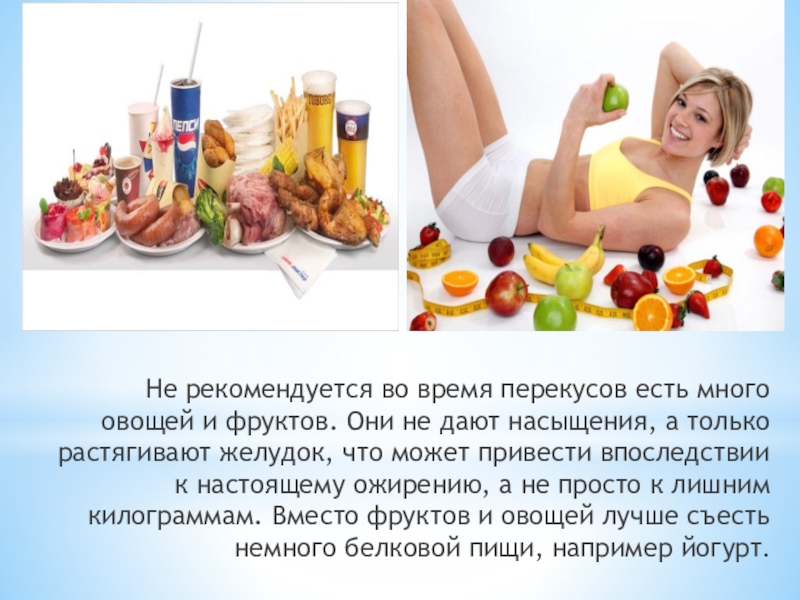 не дают насыщения, а только растягивают желудок, что может привести впоследствии к настоящему ожирению, а не просто к лишним килограммам. Вместо фруктов и овощей лучше съесть немного белковой пищи, например йогурт.