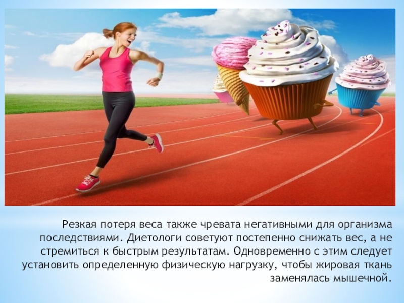 Слайд 6Резкая потеря веса также чревата негативными для организма последствиями. Диетологи советуют