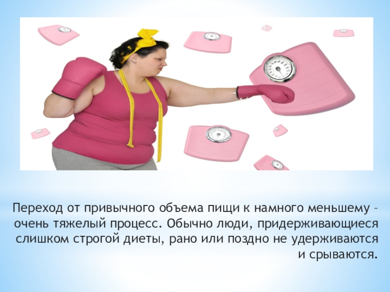 Слайд 9Переход от привычного объема пищи к намного меньшему – очень тяжелый