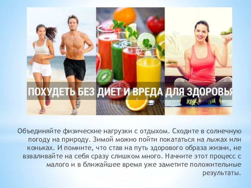Слайд 24Объединяйте физические нагрузки с отдыхом. Сходите в солнечную погоду на природу.