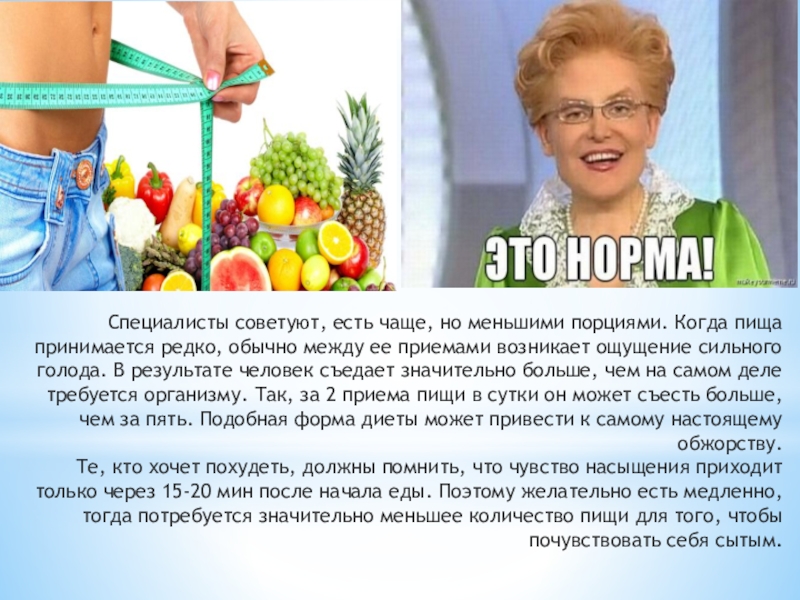 Слайд 12Специалисты советуют, есть чаще, но меньшими порциями. Когда пища принимается редко,
