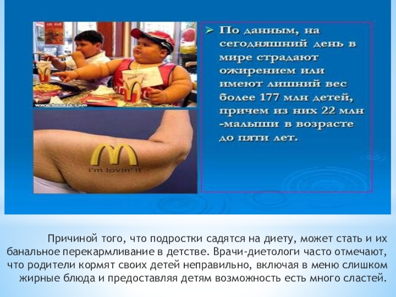 банальное перекармливание в детстве. Врачи-диетологи часто отмечают, что родители кормят своих детей неправильно, включая в меню слишком жирные блюда и предоставляя детям возможность есть много сластей.
