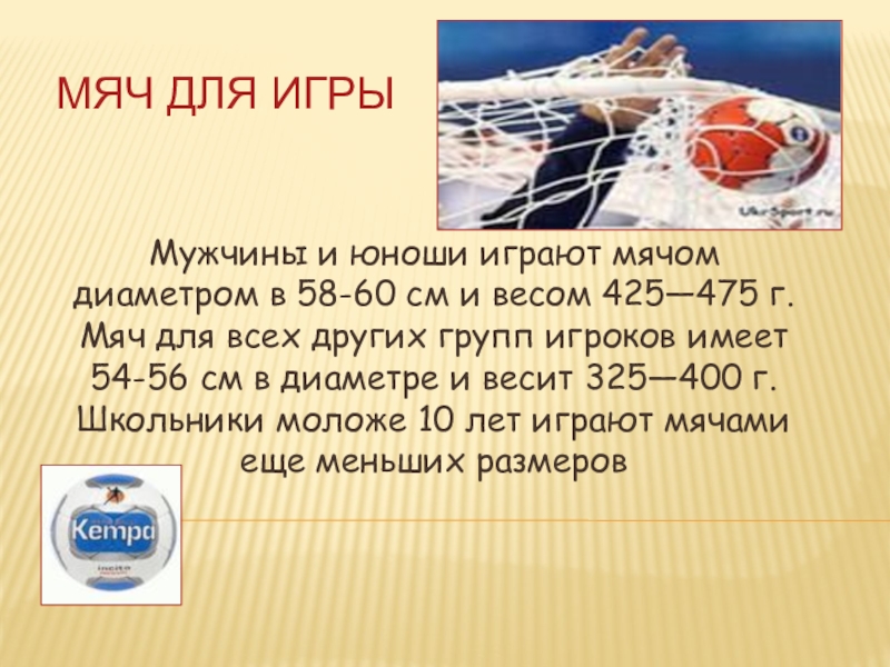 см и весом 425—475 г. Мяч для всех других групп игроков имеет 54-56 см в диаметре и весит 325—400 г. Школьники моложе 10 лет играют мячами еще меньших размеров