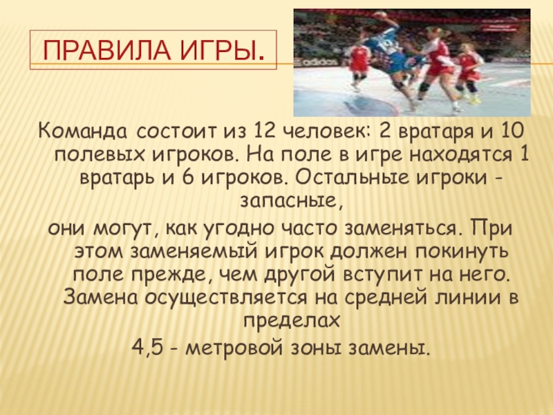 командная спортивная игра, представляющая собой перебрасывание руками мяча партнерам с целью поразить ворота соперника из-за 6-метровой зоны перед ними.