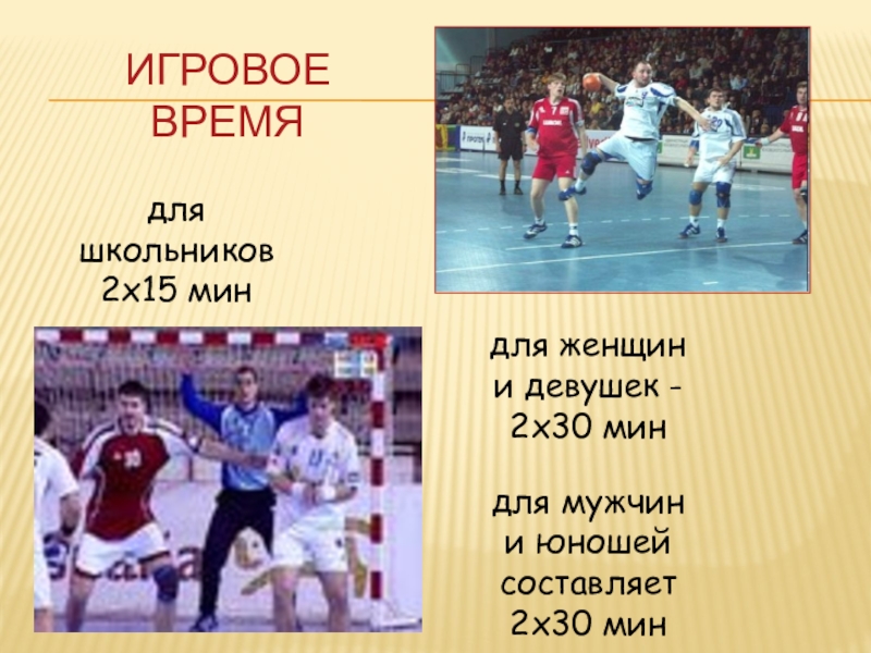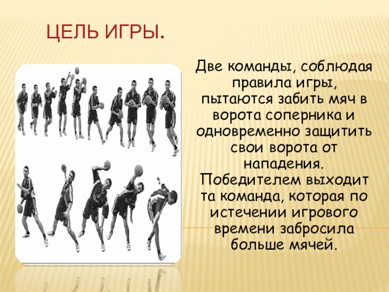 ворота соперника и одновременно защитить свои ворота от нападения. Победителем выходит та команда, которая по истечении игрового времени забросила больше мячей.