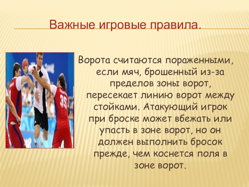 линию ворот между стойками. Атакующий игрок при броске может вбежать или упасть в зоне ворот, но он должен выполнить бросок прежде, чем коснется поля в зоне ворот.