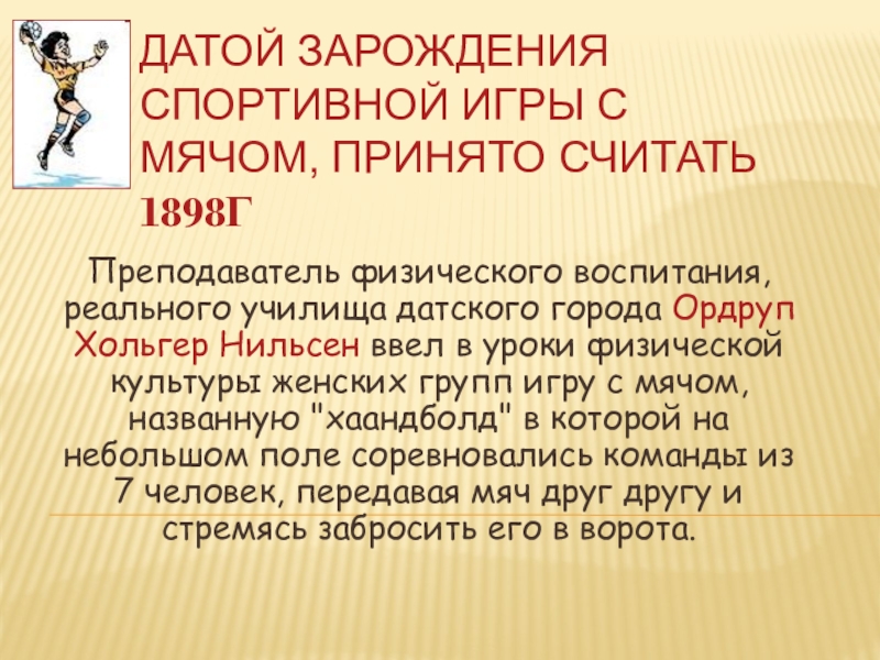 реального училища датского города Ордруп Хольгер Нильсен ввел в уроки физической культуры женских групп игру с мячом, названную "хаандболд" в которой на небольшом поле соревновались команды из 7 человек, передавая мяч друг другу и стремясь забросить его в ворота.