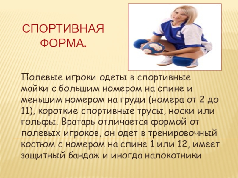 на спине и меньшим номером на груди (номера от 2 до 11), короткие спортивные трусы, носки или гольфы. Вратарь отличается формой от полевых игроков, он одет в тренировочный костюм с номером на спине 1 или 12, имеет защитный бандаж и иногда налокотники
