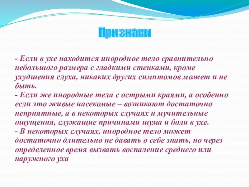 - В некоторых случаях, инородное тело может достаточно длительно не давать о себе знать, но через определенное время вызвать воспаление среднего или наружного уха