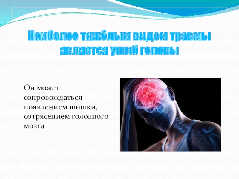 Слайд 7Наиболее тяжёлым видом травмы является ушиб головы