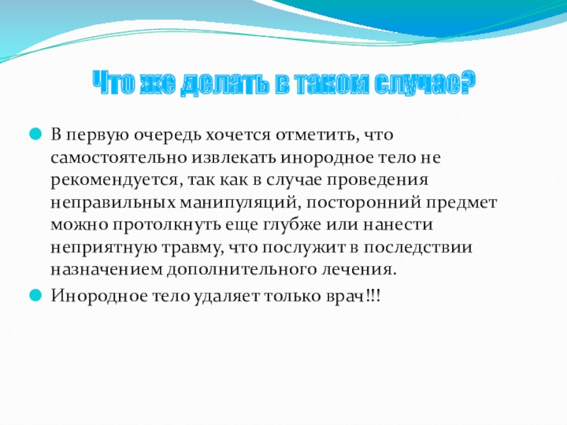 самостоятельно извлекать инородное тело не рекомендуется, так как в случае проведения неправильных манипуляций, посторонний предмет можно протолкнуть еще глубже или нанести неприятную травму, что послужит в последствии назначением дополнительного лечения.