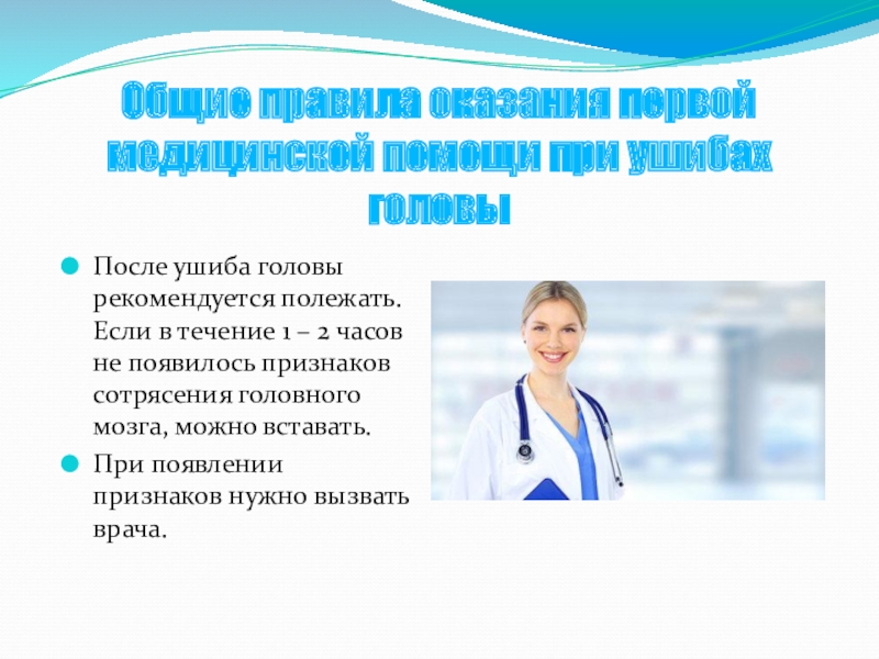 Слайд 9Общие правила оказания первой медицинской помощи при ушибах головы