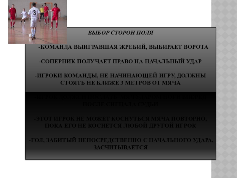 -ИГРОКИ КОМАНДЫ, НЕ НАЧИНАЮЩЕЙ ИГРУ, ДОЛЖНЫ СТОЯТЬ НЕ БЛИЖЕ 3 МЕТРОВ ОТ МЯЧА