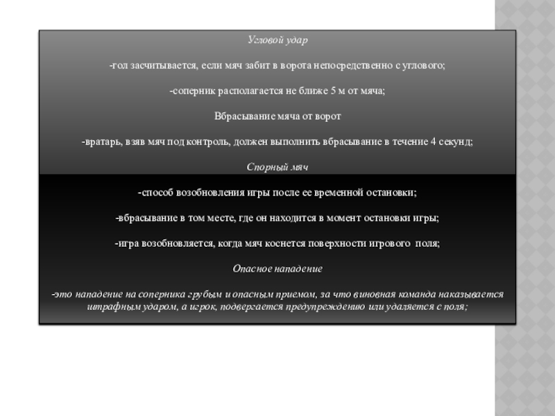 -ВСЕ ИГРОКИ ПРОТИВОПОЛОЖНОЙ КОМАНДЫ ДОЛЖНЫ РАСПОЛАГАТЬСЯ НЕ БЛИЖЕ 5 М ОТ МЯЧА ДО ТЕХ ПОР, ПОКА ТОТ НЕ ВОЙДЕТ В ИГРУ;