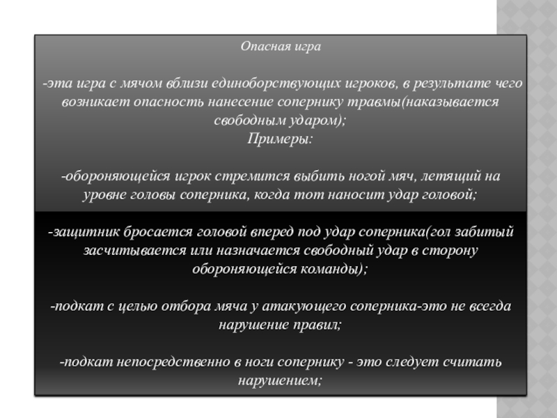 возникает опасность нанесение сопернику травмы(наказывается свободным ударом);