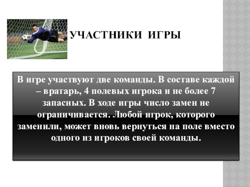 4 полевых игрока и не более 7 запасных. В ходе игры число замен не ограничивается. Любой игрок, которого заменили, может вновь вернуться на поле вместо одного из игроков своей команды.